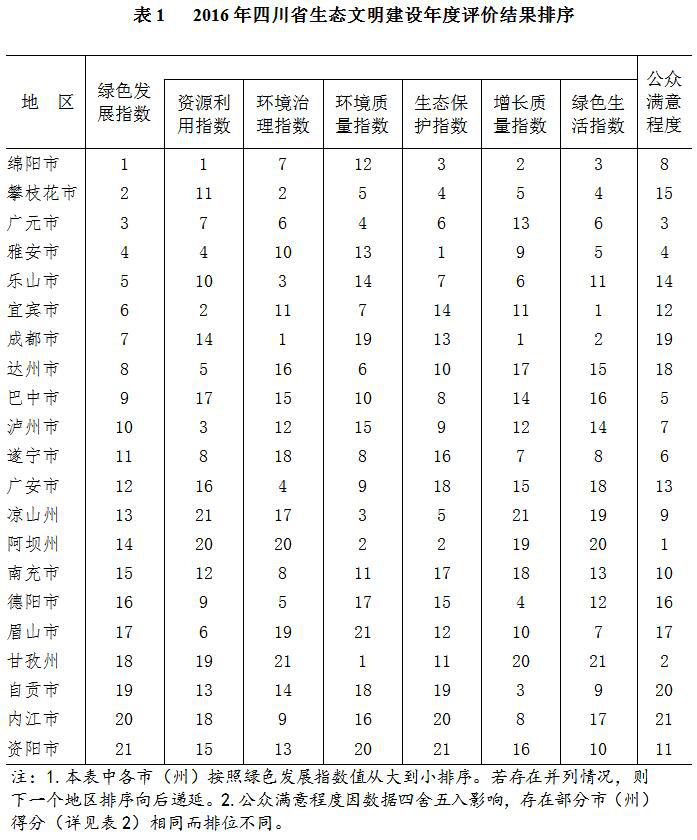 根据《中共四川省委办公厅四川省生态文明建设评价考核办法的通知》(川委办〔2017〕26号)和《四川省绿色发展指标体系》《四川省生态文明建设考核目标体系》要求,现将2016年各市(州)生态文明建设年度评价结果公布如下: